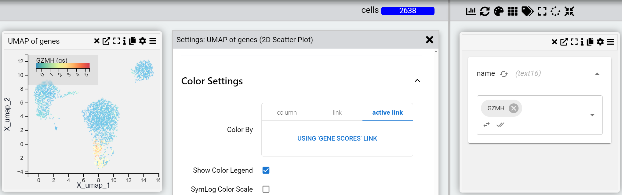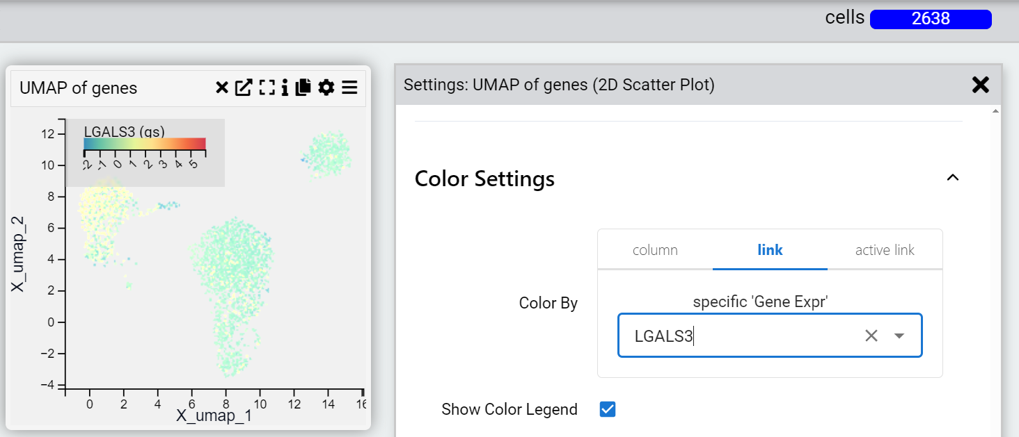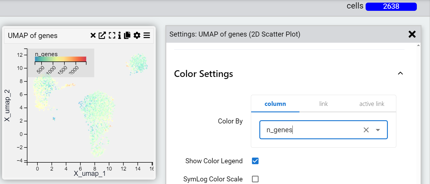 For example, a scatterplot is made based on the values of the column UMAP_1 and UMAP_2 in the "cells" table of an anndata object. The points in the UMAP maybe be coloured to reflect using the "Color by" setting to reflect: